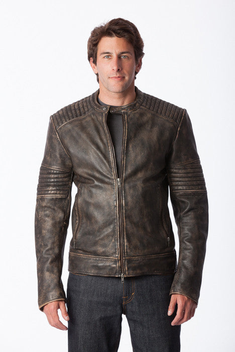 Perfect for the season! This distressed sheepskin moto inspired biker jacket is hand treated for a vintage lived in look. Heavy duty stitching reinforces the quilted shoulders and sleeves for the epitome of cool. Pair with our premium raw jeans for a complete look.